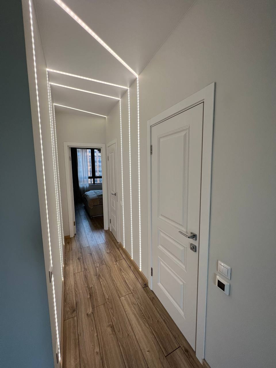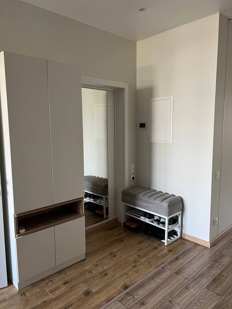 Планировка распашонка: спальня выходит окнами в тихий внутренний двор, а кухня и вторая комната — на внешнюю сторону дома. Есть отдельная гардеробная со встроенными системами хранения. Квартира очень светлая, современная и функциональная.