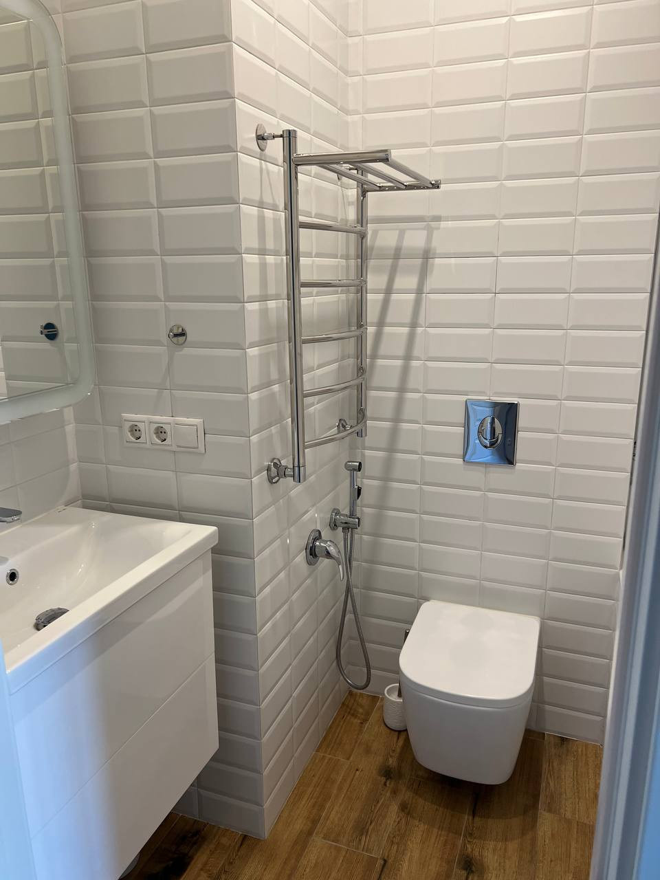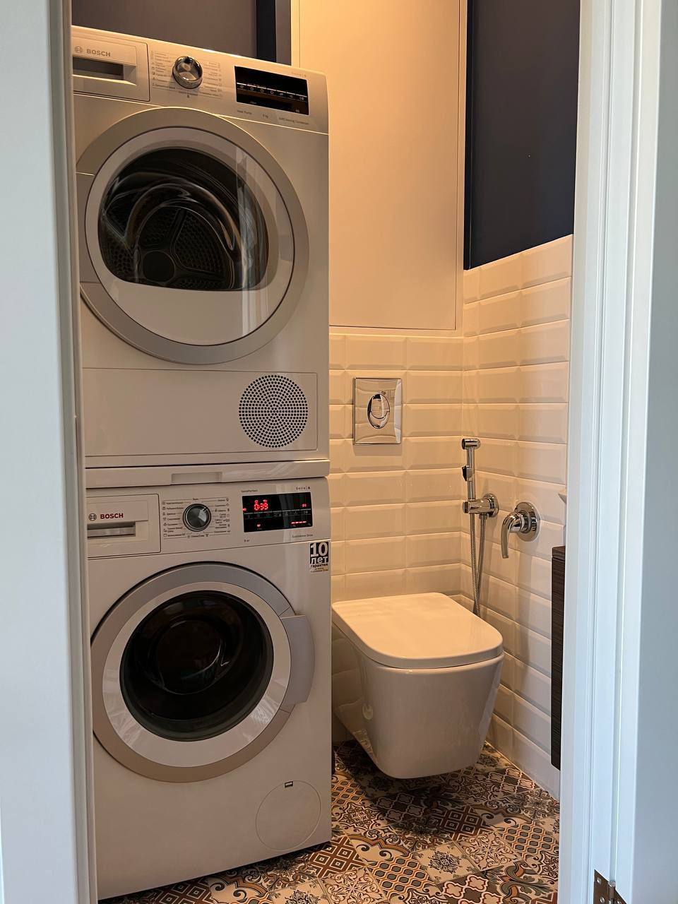 В квартире 2 санузла и одна ванная комната. Квартира продается со всей мебелью и техникой: полноценная кухня со встроенной техникой, стиральная машина и сушильная машина Bosch, телевизоры и вся необходимая мебель — можно сразу заезжать и жить.